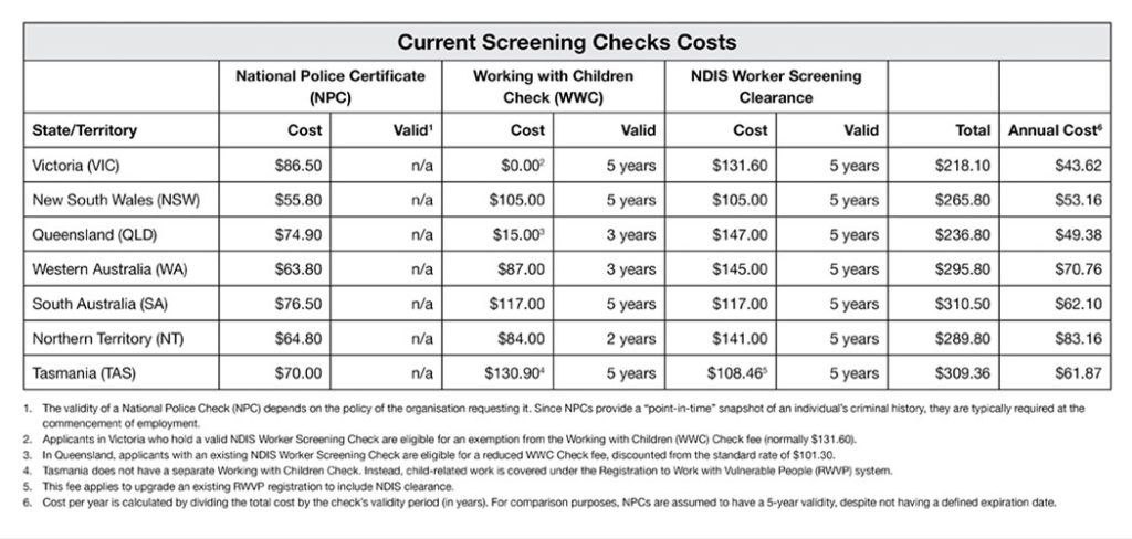 Screening Checks costs, and how long there are valid for, vary across Australia.