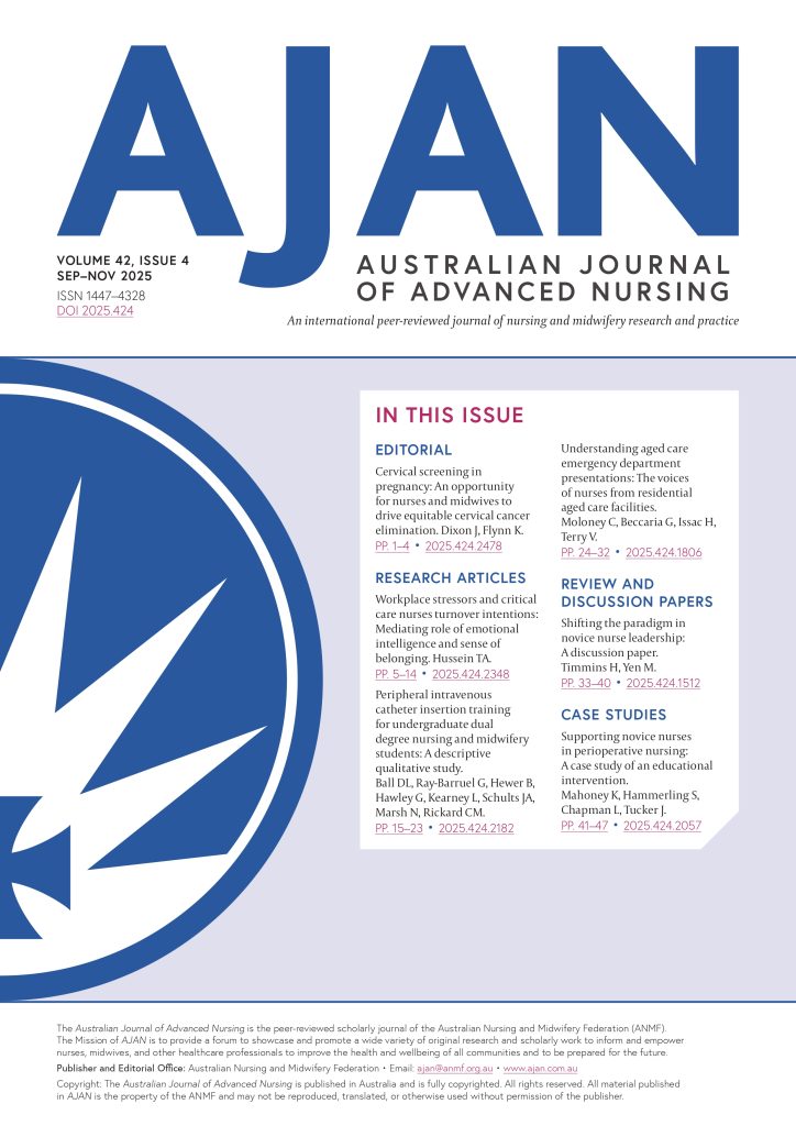 AJAN is Australia’s premier nursing and midwifery scholarly journal published by the ANMF. The peer reviewed journal showcases diverse original research and scholarly contributions aimed at empowering nurses and midwives and healthcare professionals
